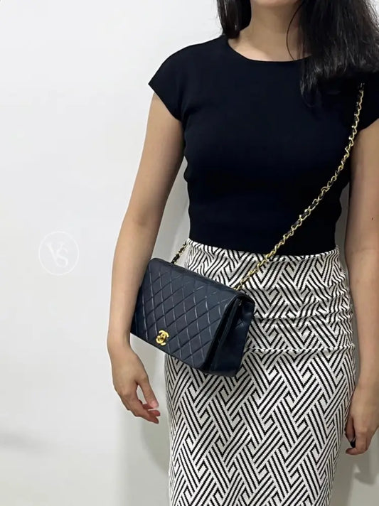 CHANEL 1989-91 Navy Lambskin Classic Quilted Full Flap Crossbody Bag Medium in 24k GHW